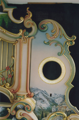 This re-created Wurlitzer 165 facade was carved by Bob Yorburg. The illustrations were designed and painted by Marguerite Juner from the client's own photographs. Pam Hessey designed the colour, leaf and paint on the raised carved areas surrounding the illustrations.