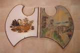 Under the white enamel and kitschy decals of swans and ponies, Pam found some badly damaged original paint. Here are two illustration panels; one before and one after the white enamel and decals had been removed. The original paint design was exposed by carefully chipping off the subsequent layers using a scalpel. Then the original layer was then sealed with a reversible varnish and recreated.
