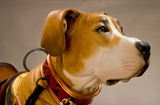 Buster is a serious guard dog, dressed in armor leafed with yellow gold, white gold and copper leaf.